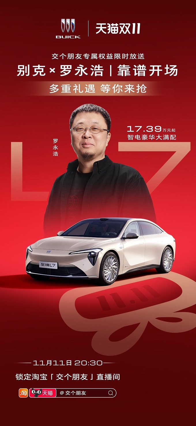 11月11日,这个全民狂欢的购物节,别克与罗永浩这对“老搭档”再次强强联手,为热爱品质生活的你带来一场期待已久的超级直播盛宴!这一次,我们回到熟悉的「交个朋友」直播间,主角是别克家族的明星新车型——至境L7。史无前例的专属权益,错过等一年的超级福利,这个双十一,我们直播间不见不散!