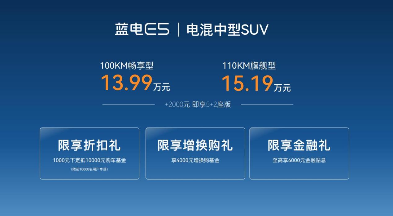 此外,蓝电E5为用户提供了三重购车福利。即日起购买蓝电E5,前1万用户可享交1千抵1万的限享折扣礼,购车用户还可享受4000元增换购基金和至高6000元金融贴息等购车福利。