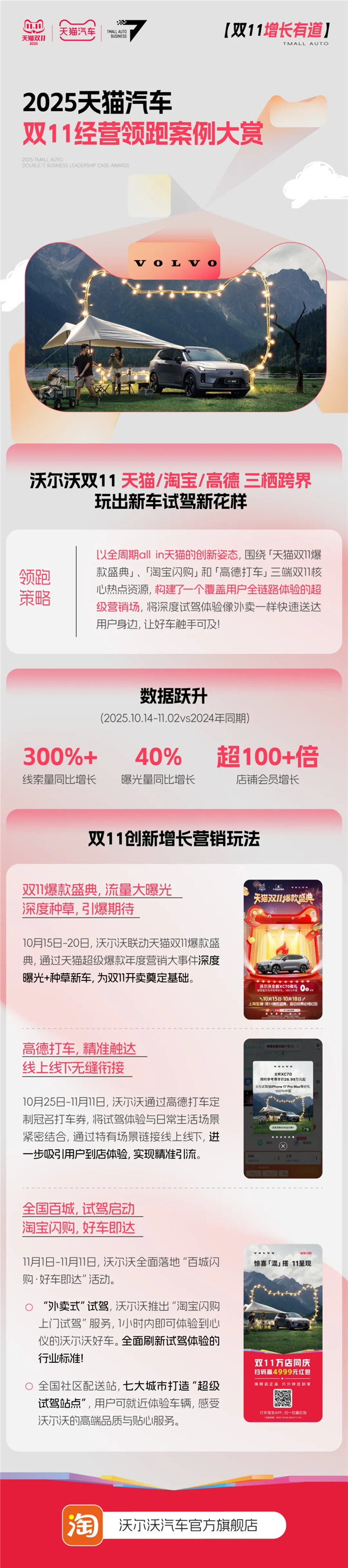 沃尔沃以全周期All in天猫的创新姿态,打破了汽车品牌传统营销的边界。它并非简单投放广告,而是深度融入「天猫双11爆款盛典」、「淘宝闪购」和「高德打车」三大核心场景,将营销触点无缝嵌入用户的“逛、买、行”之中。