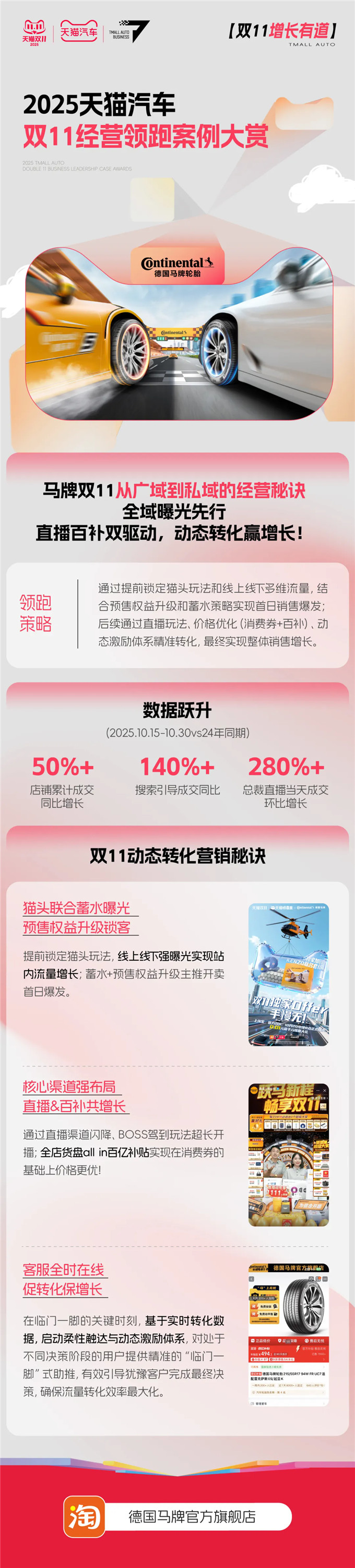 战果印证:店铺累计成交增长50%+,总裁直播当天成交环比增长280%+,体现了其从流量获取到最终转化全链路的精细化运营能力。